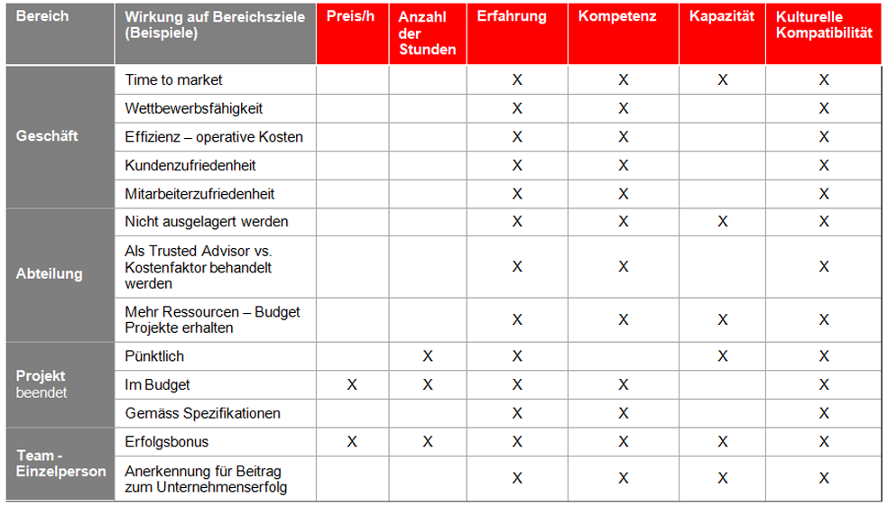 Die meisten Firmen arbeiten bei der Auswahl von IT Ressourcen mit den klassischen Entscheidungskriterien wie Preis pro Stunde, Verfügbarkeit und Erfahrung von Ressourcen. Wie relevant diese Kriterien für den Geschäftserfolg sind, wird kaum explizit betrachtet.