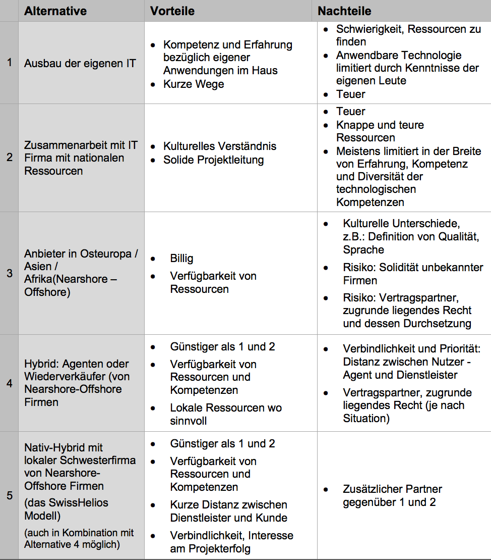 „Nichts tun“ ist keine Alternative für Unternehmen, die im Markt bestehen wollen. Aber was tun? Die folgende Tabelle gibt einen groben Überblick über Vor- und Nachteile verschiedener Lösungsansätze.